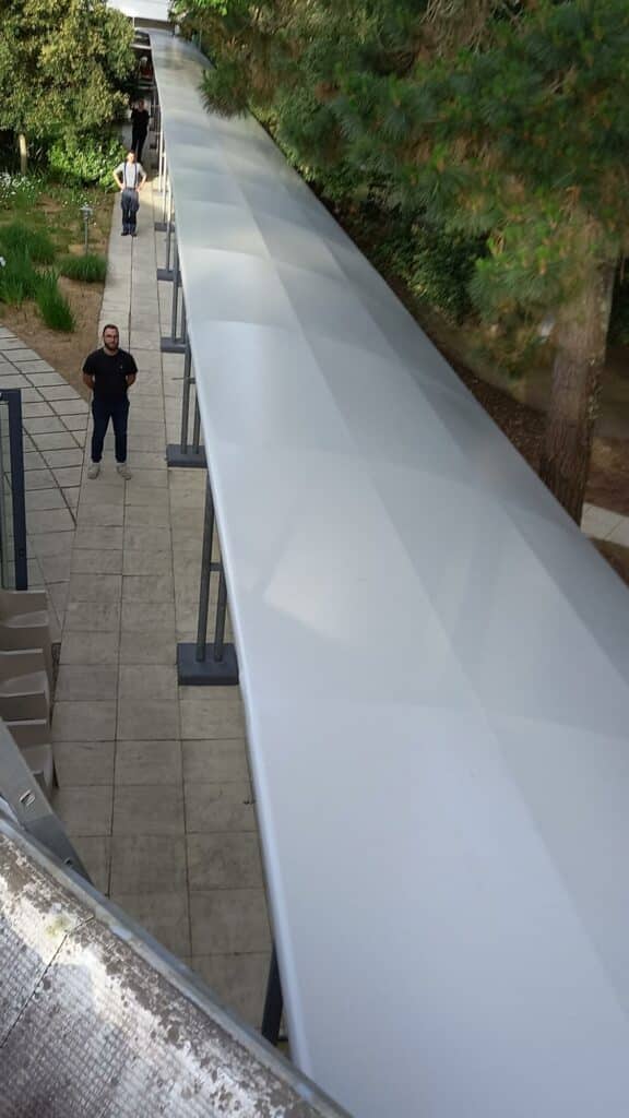 Une fois le devis accepté, nous réalisons la prise des côtes au laser 3D, afin de pouvoir procéder à la conception et à la fabrication de la voile d’ombrage.